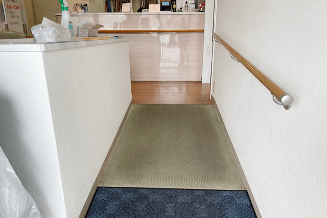 入口は車椅子の方も入りやすい広さで、スロープと手すりを設置しています。