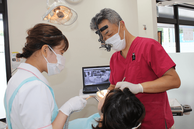 当院では基本的に、患者さんの背もたれを完全には倒さずドクターが立った状態で治療します。歯を削る時にのどに水が入りやすい方や腰の悪いご高齢の方などに好評です。