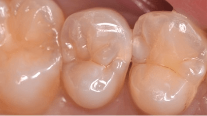 写真の症例は両側の隣接面からむし歯になっていました。むし歯を取り残さない最低限のエナメルの削合を行っています。上から見ると入口はこの程度の大きさですが、中広くむし歯を除去した窩洞が拡がっています。歯髄には達していない状態でした。
