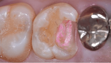 むし歯菌は境界不明瞭に歯の中に入り込んでいます。健全歯質も含め、大きく削れば、取り去ることは容易です。しかし、それでは歯髄の保存はおろか、歯の寿命まで大きく削ることになりかねません。