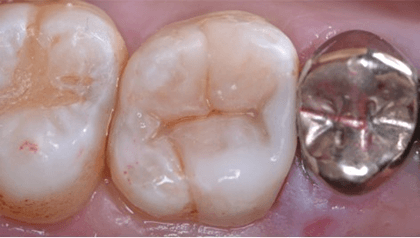 写真の症例は金属の修復物の下に2次むし歯ができたケースです。かなり深かったですが、歯髄処置なしで済みました。広範囲の修復なので、色調より、物性重視で丈夫な素材を選択しました。隣接は物が挟まらないように適切な接触点を与えています。