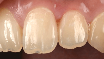 写真の症例は左側上顎中切歯と側切歯の間の象牙質むし歯です。中切歯は比較的深く、歯髄近くまで及んでいました。歯頚部の不透明感から切端部の透明感を表現するために5種類の色調を使用しました。表面をピカピカに研磨することで、きれいなだけでなく、変色、着色も予防することができます。