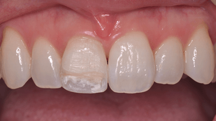 写真の症例は外傷のケースです。昔、前歯を打って、歯が割れ、歯髄も失いました。失った歯質をプラスチックで何度修復してもきれいにならず悩まれていました。ファイバーコアを用いたダイレクトボンディングを行っています。