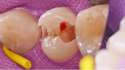 むし歯が大きいとむし歯菌感染歯質を除去中に歯髄が露出する場合があります。従来は歯髄を除去する処置になっていました。歯髄を失い、かぶせ物をした歯の寿命は短くなっていました。