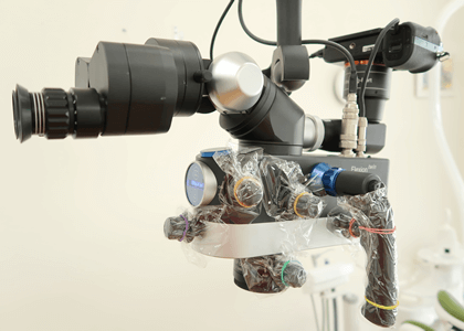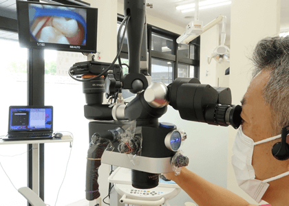 当院では、歯の寿命を考えた「できるだけ削らない」「できるだけ神経を取らない」「できるだけ元通りの状態に戻す」治療のために最高性能のマイクロスコープを導入し、拡大された視野の中で、妥協のない精密なむし歯修復治療を行っています。
