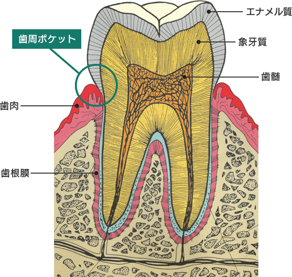歯ぐきは、歯に触れているだけで、直接つながっていません。そのため、歯と歯ぐきの間にはすき間があります。このすき間を歯周ポケットと言います。正常な歯ぐきの厚さは、2~3ミリですので、正常な歯周ポケットの深さも2~3ミリということになります。