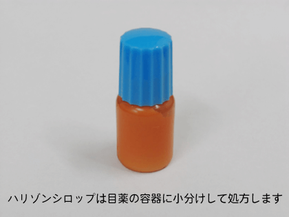 他に、歯ブラシにつける薬も使っていただきます。ハリゾンシロップという元々カンジダ症の方に飲んでいただく飲み薬を、歯ブラシに1滴つけて磨いていただきます。目薬の容器に小分けして処方します。カビを退治することにより、汚れが落ちやすくなる効果があります。症状により、1~2本使っていただきます。