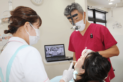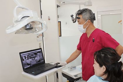 その際に「歯周病」が疑われる場合は顕微鏡を用いて、歯周病の有無をテレビモニターで患者様と一緒に確認致します。(無料)