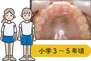 乳歯の奥に永久歯 (6才臼歯) が生え、前歯も生え変わります。前歯の歯並びがデコボコしている場合、この時期からの矯正治療をおすすめします。