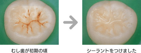 その予防として、歯を削らずに溝の深いところだけを特殊なプラスチックで埋める「シーラント」という予防治療が有効です。(保険適応)