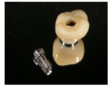 このケースはジルコニアという素材で作ります。表面がツルツルで汚れが付きにくいというメリットがあります。インプラント本体とは、ネジで固定します。