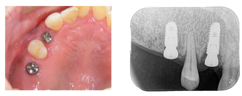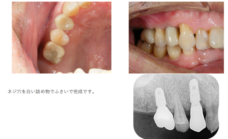 【インプラント症例】抜歯後2週間で埋め込みしたケース 2023.10.13 インプラント症例 歯周病で、前から4番目の歯がグラグラになっていたので抜歯しました。このまま放置すると、孤立している1本の歯も時間の問題で抜けてしまいます。前後に1本ずつ埋め込みする計画になりました。抜歯直後の部位は、骨量が足りないので、少し骨造成しました。 埋め込みして、3ヶ月待ちました。 3ヶ月待って、歯型を採り上部構造を作ります。ネジで固定します。