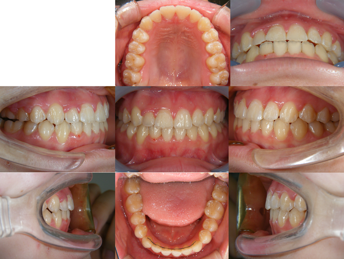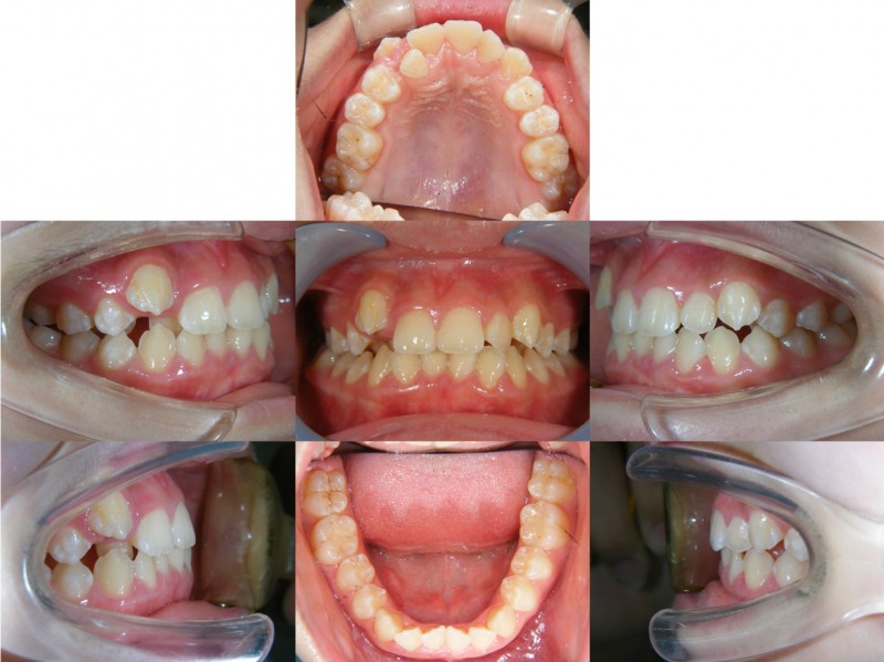 前歯が凸凹になっていますが、右上奥歯のかみ合わせが原因になって、前歯のスペース不足が起きています。
