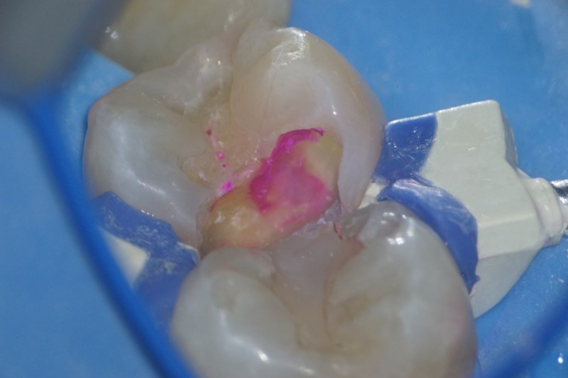 う蝕検知液で残っている虫歯を確認します。