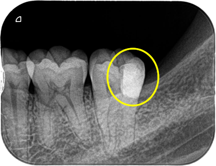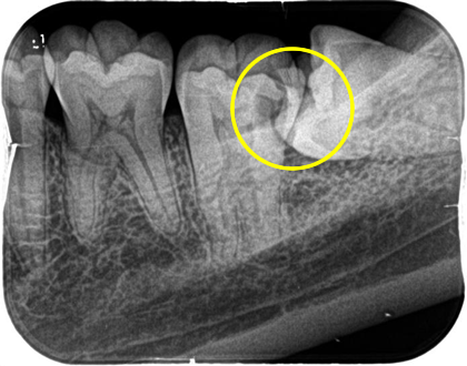 上の写真のケースでは、親知らずが横を向いて前の歯との間に食渣が非常に挟まりやすい状態になっていました。患者さんご本人も気になっていましたが放置されていたため、左下の歯が痛くなり、来院された時には親知らずの前の歯が神経に達するほどのむし歯になっていました。