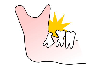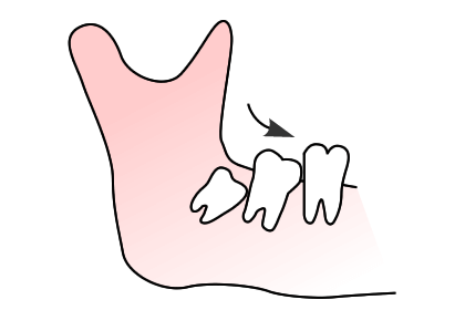 親知らずが傾斜して前の歯に引っかかっているケースは、前の歯が虫歯になりやすいので、症状が無くても早期に抜歯した方が良いことがあります。
